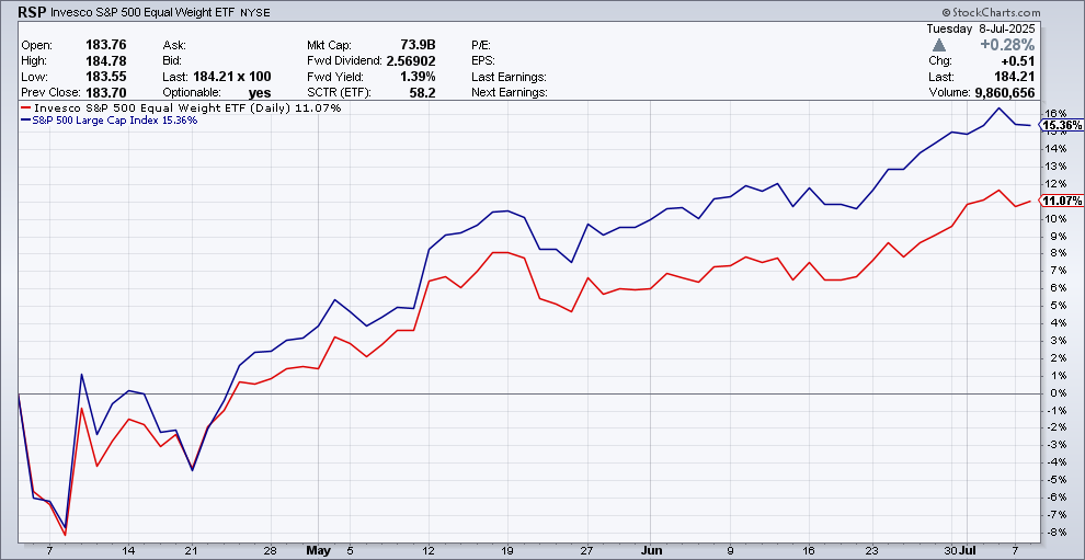 Here’s a look at how the S&P 500 (in blue) has outpaced the Equal Weight (in red) over the last three months: