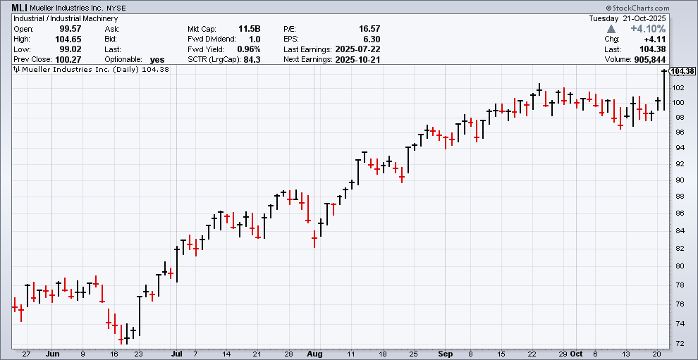Over the summer, I told you about Mueller Industries (MLI), which is one of our Buy List stocks. I like Mueller a lot. It’s a well-run mid-cap that’s largely overlooked by Wall Street. The stock is up over 30% this year.