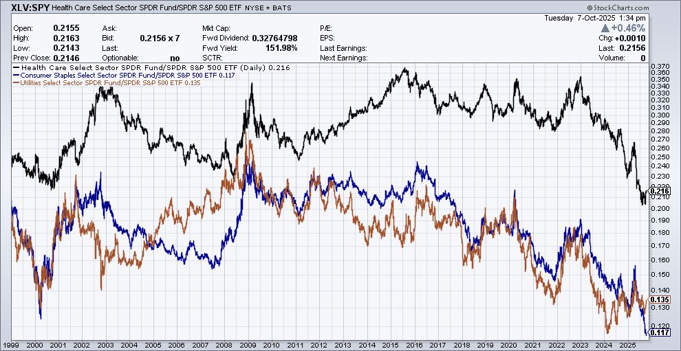 The chart below is a 25-year look at the relative performance of Healthcare (black), Staples (blue) and Utilities (brown):