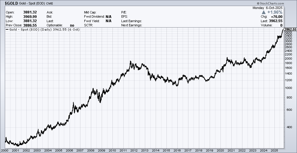 It’s not just stocks that are rallying. The price of gold soared over $4,000 per ounce for the first time. Adjusted for inflation, gold is higher now than it was at its mega-peak from 35 years ago.